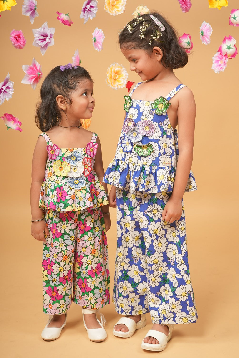 Lounge at home, party at the playground, or attend summer soirees. This quirky and fun 3D flower print set is an eye-catching summer look that can be worn together or separately. *exercise caution: this ensemble is likely to draw attention :)Top has embroidered 3D flowers patched at the right places with soft elasticated back neck for perfect fit. Ankle pants have a soft paperbag waistband and a great fit with side pockets, perfect for storing sandy treasures.• Soft cotton set
