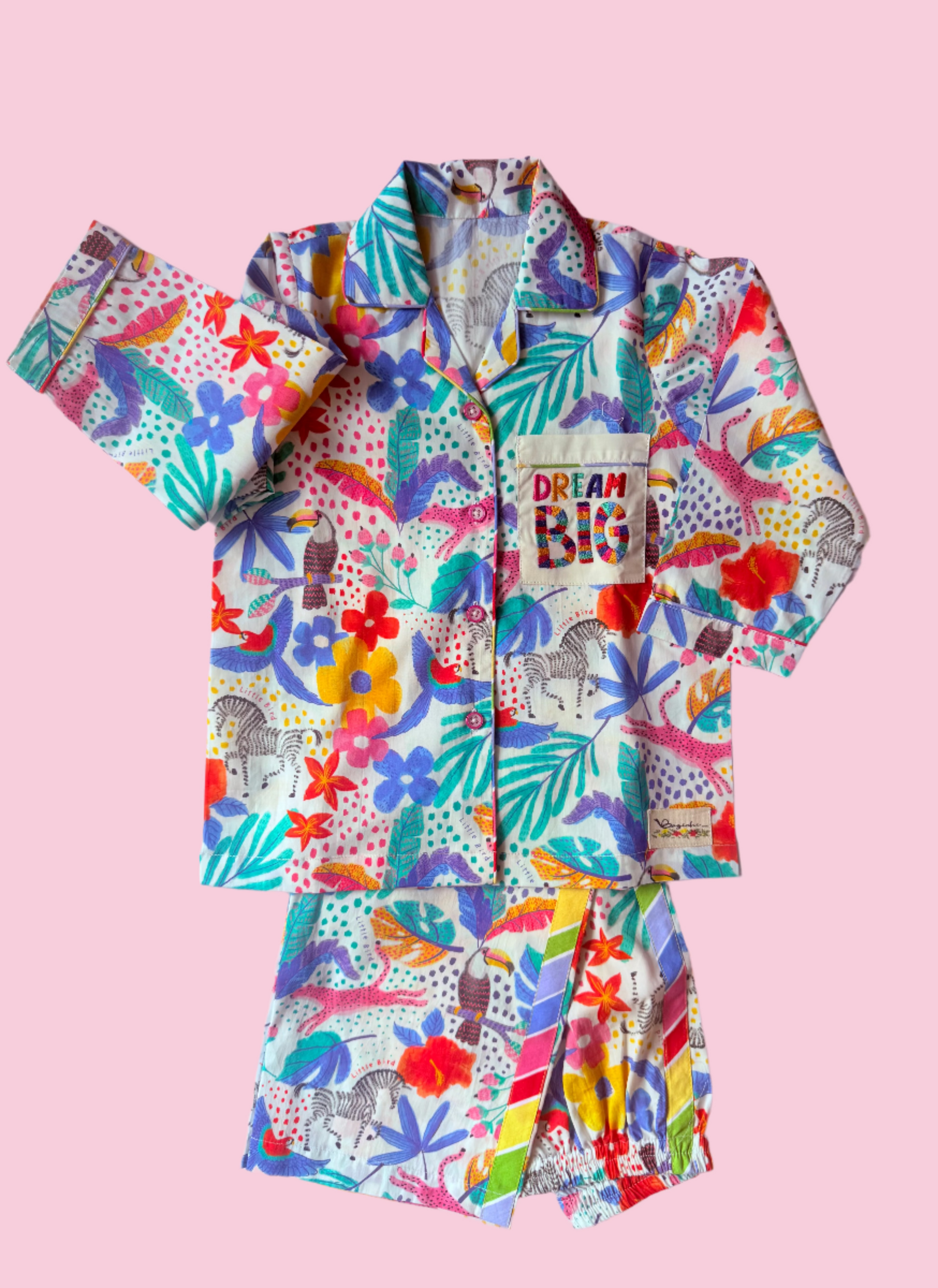 Classic collar style pjs in soft cotton in this bright floral jungle pjs