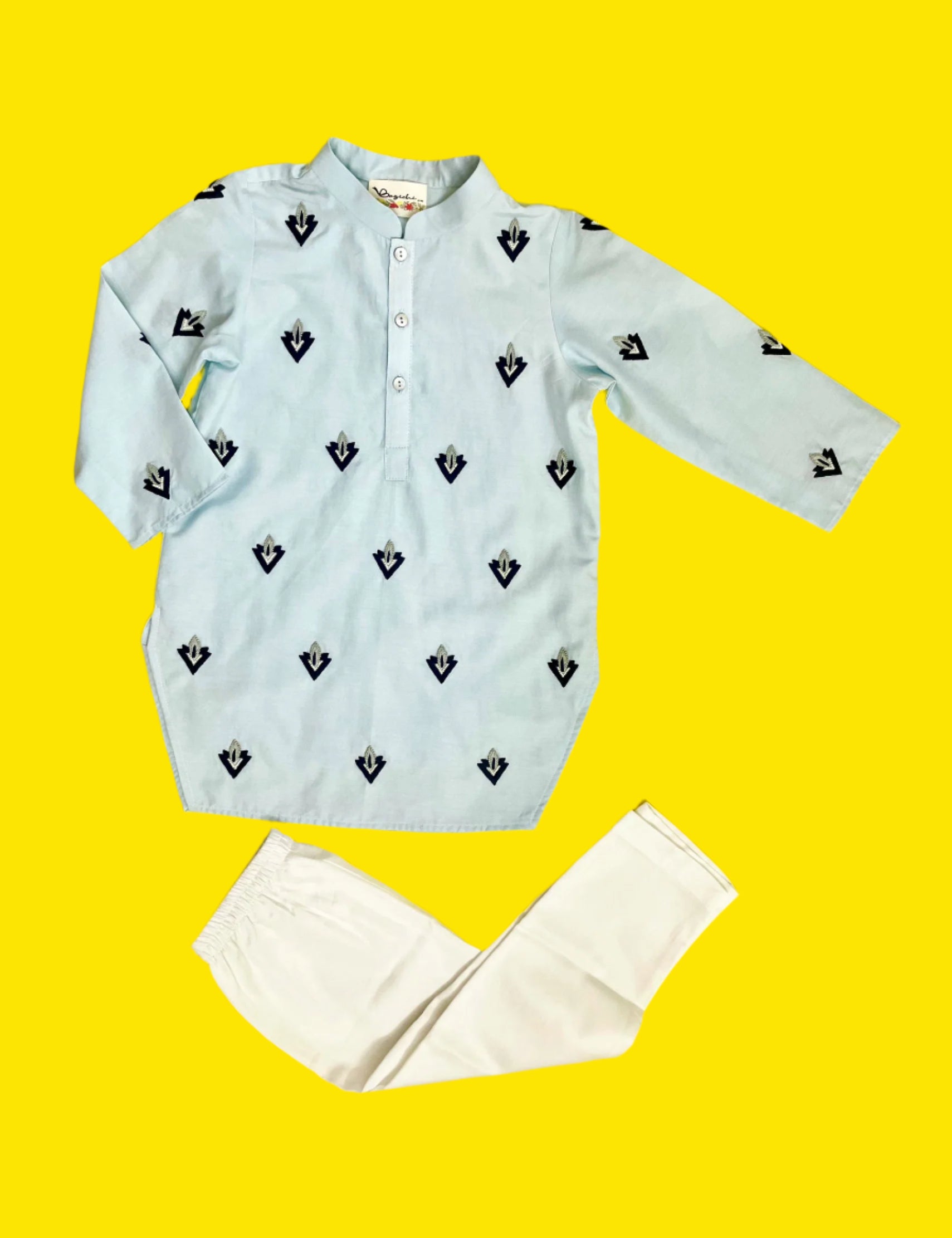 Silk kurta pajama set with mul lining and embroidered geo motifs in front