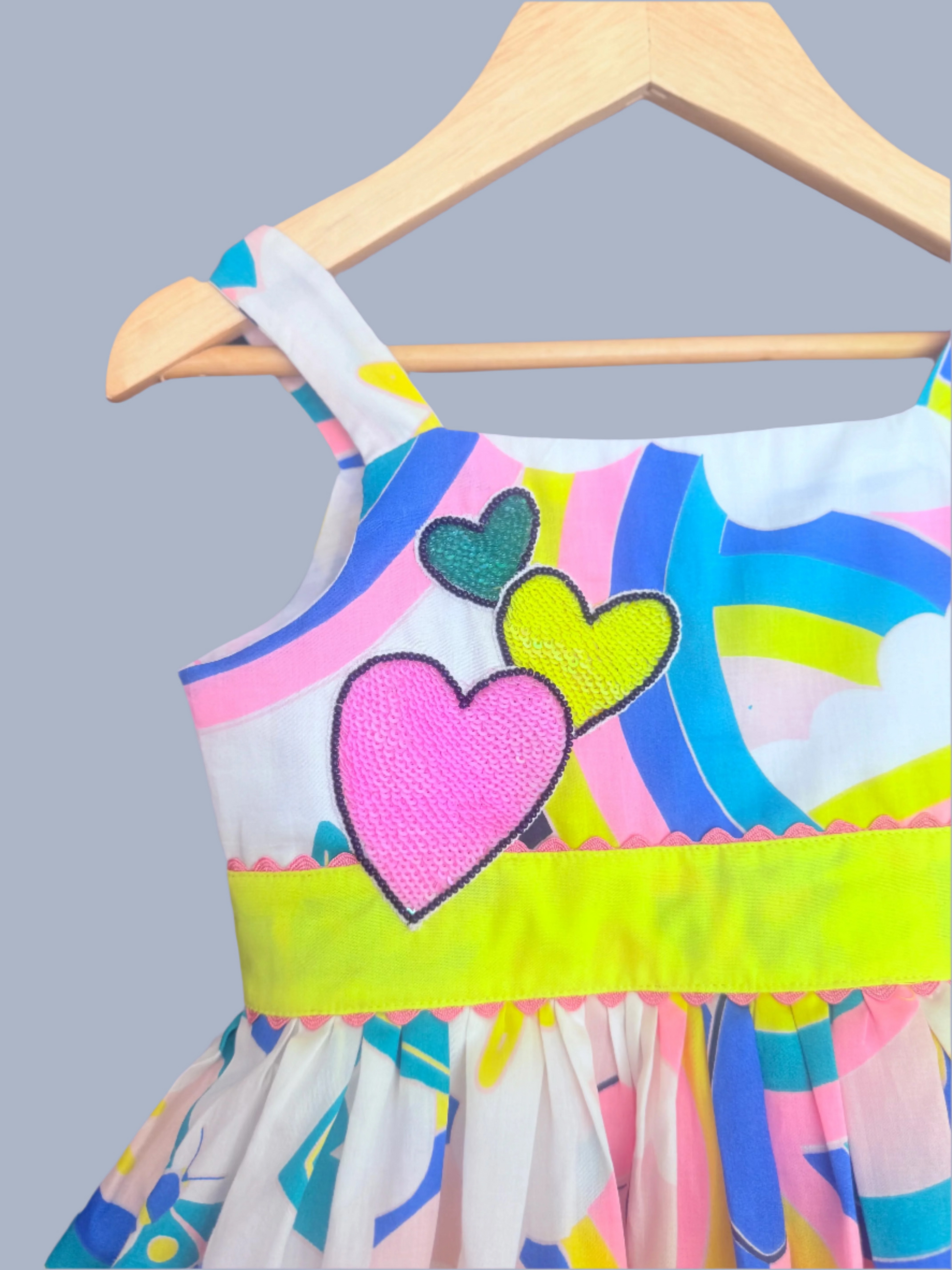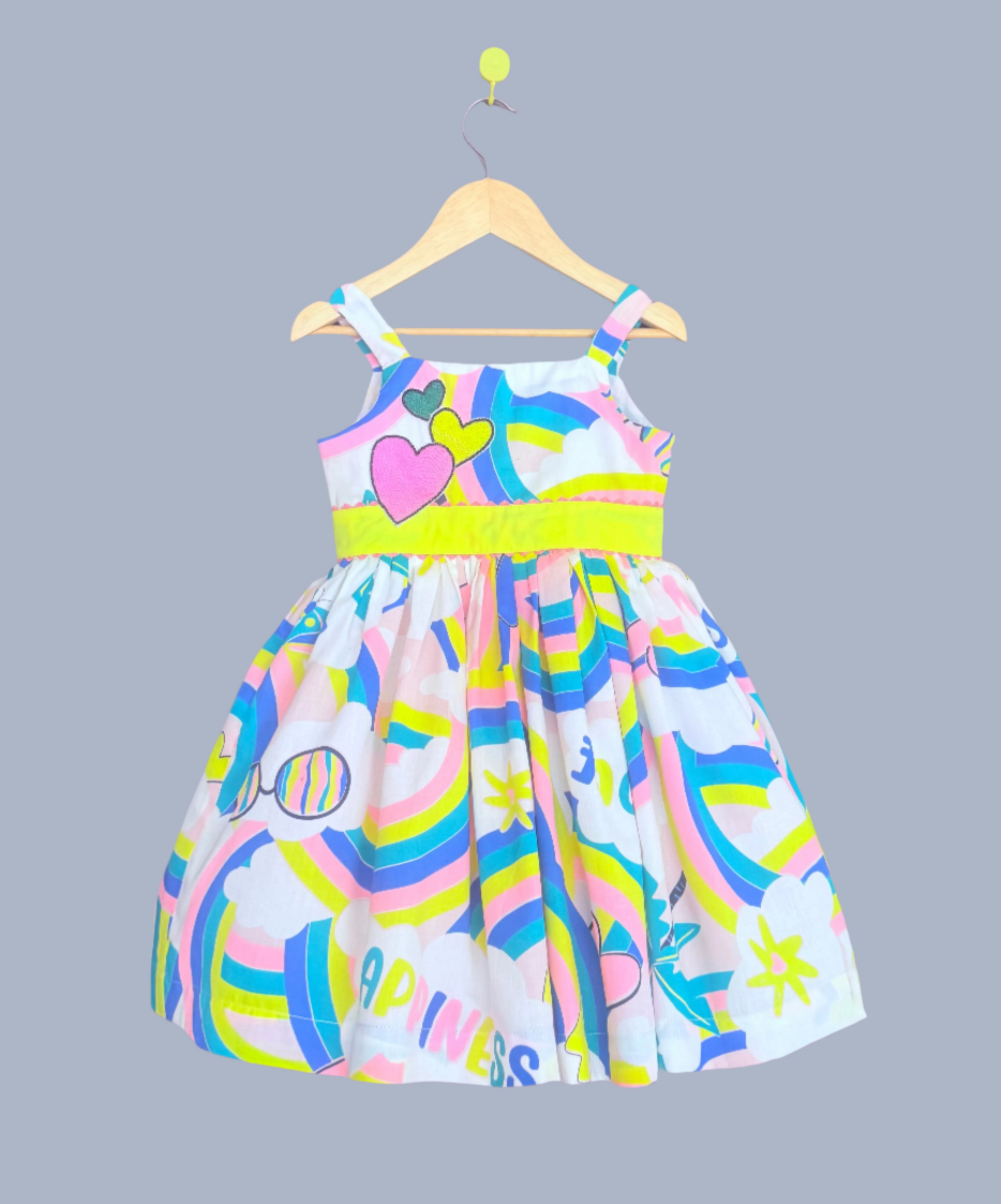 Bursting with color and joy, the Happy hearts dress in made for little sunshine souls. With playful rainbows, candy - bright hearts, and the sweetest yellow waistband, this dress brings smiles wherever it twirls. Perfect for parties, playdates and holidays.