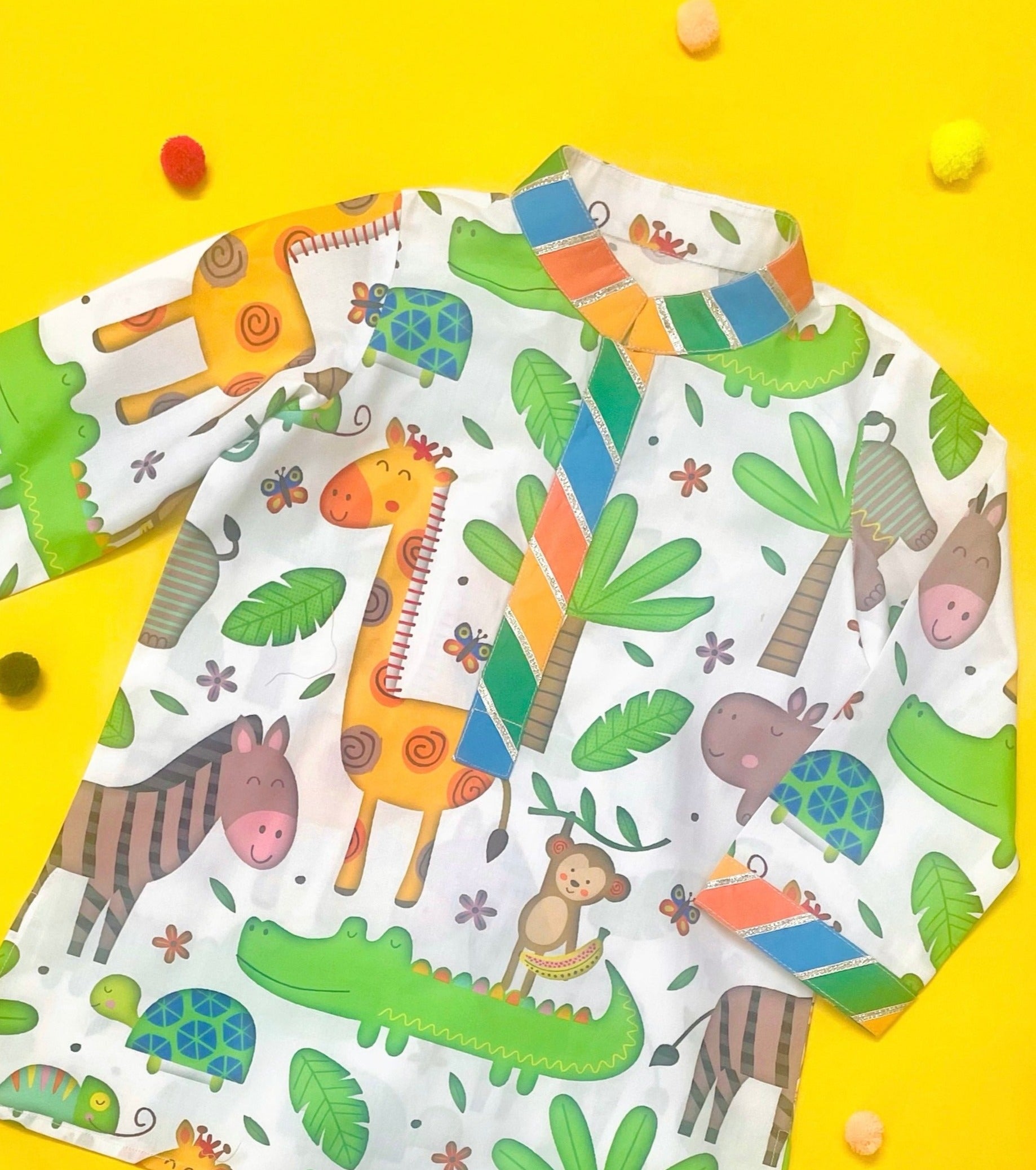 Softest Jungle print cotton kurta pajama set with Silk gota multi color handmade detailing around neck and sleeves.