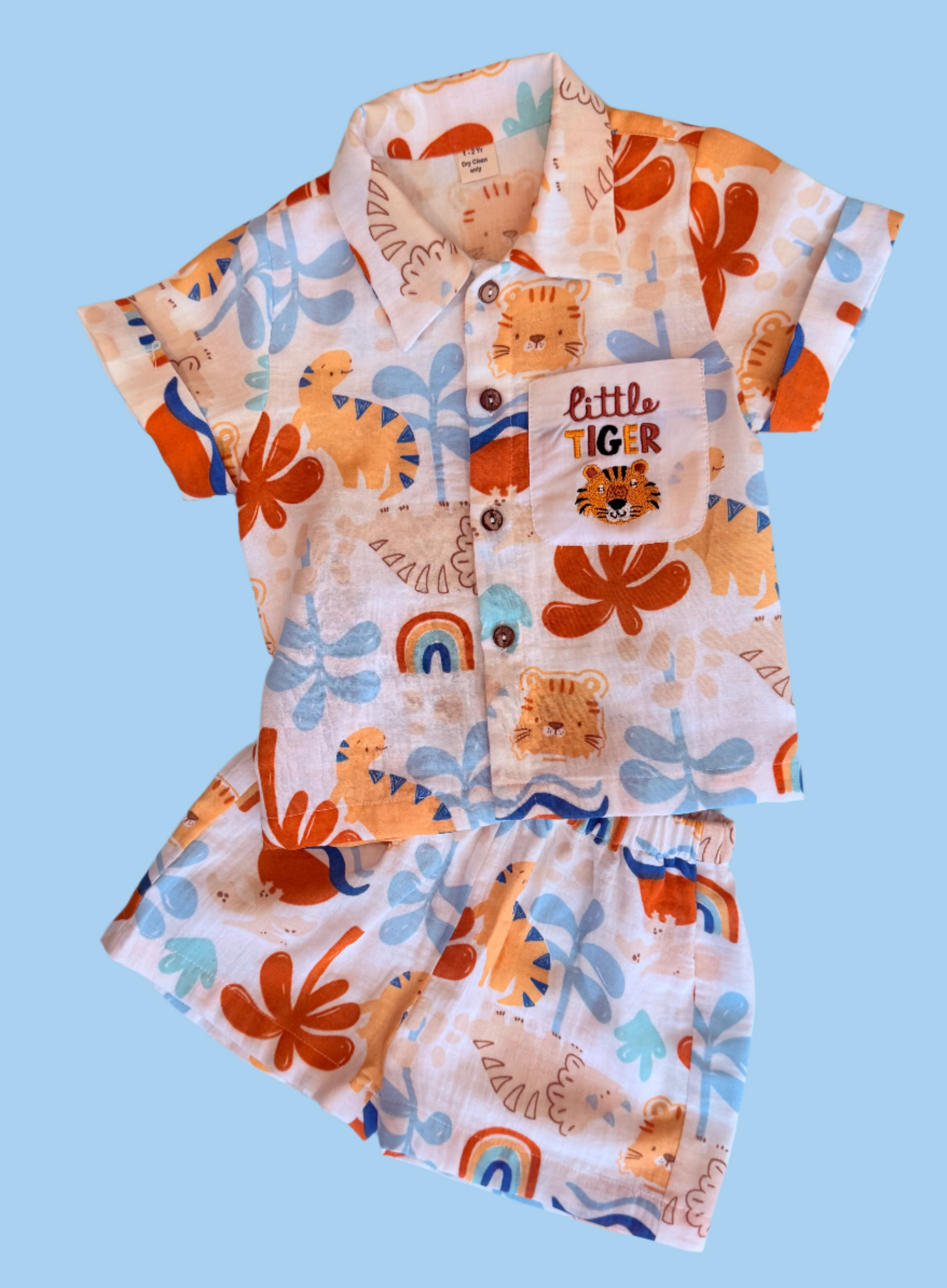 Soft muslin co-ord set. Bright Little Tiger muslin set in organic cotton.