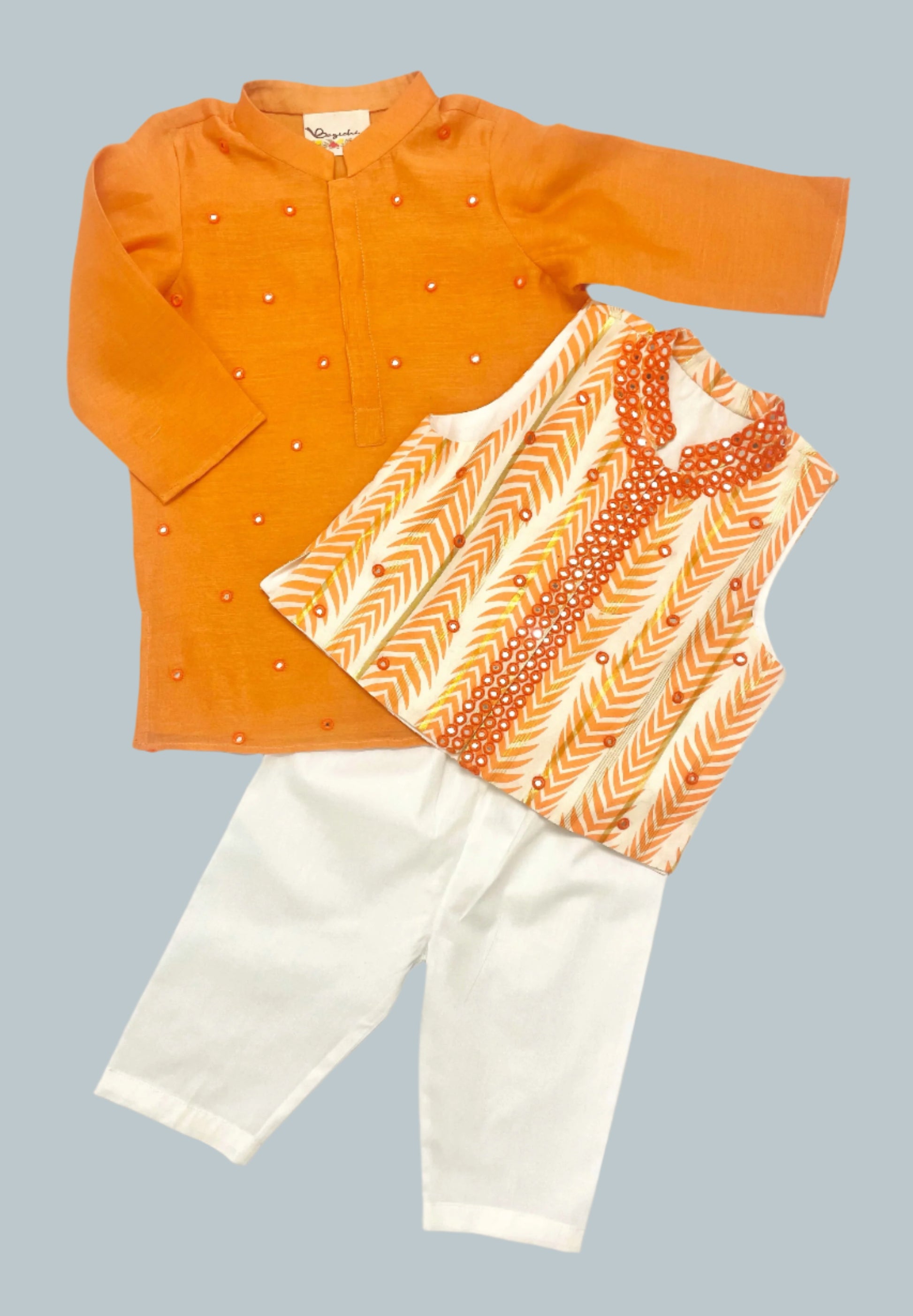Cotton Silk kurta with Hand embroidery and mirror work Nehru jacket in cotton zari print with soft pajamas.