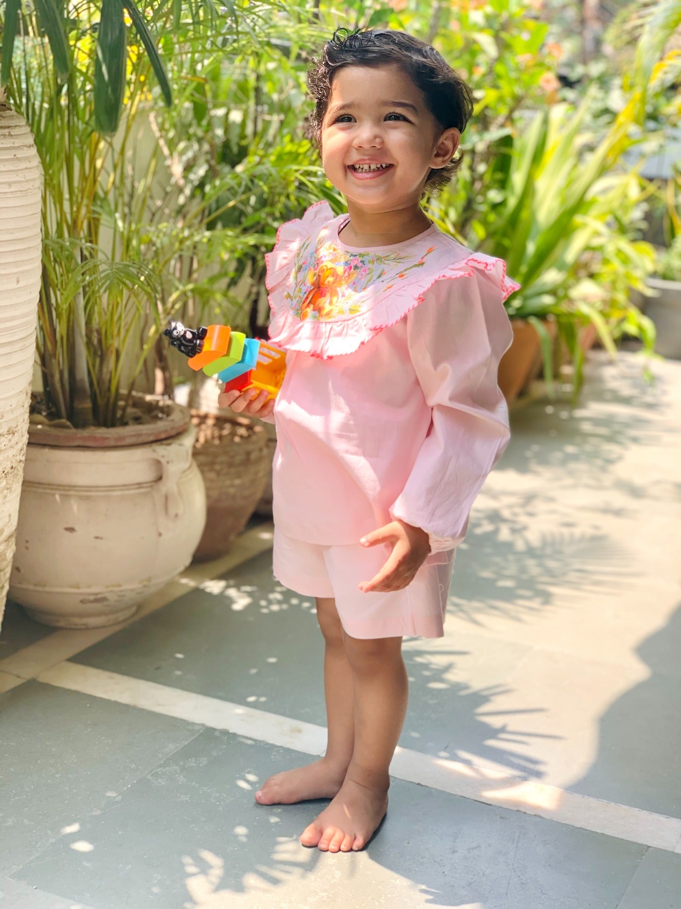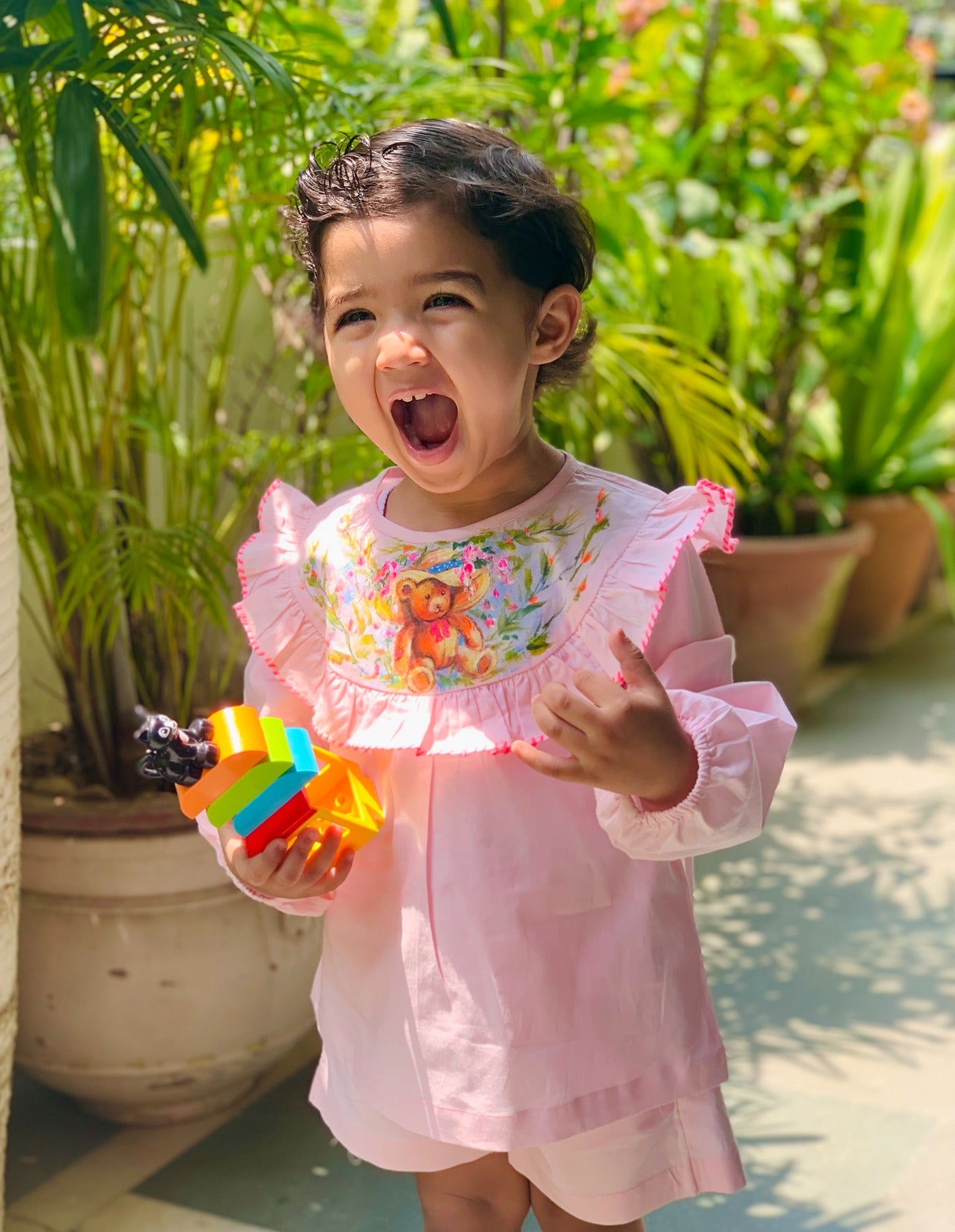 Teddy with a straw hat.. Awww!! This easy, cutest hand painted, and super comfy set is *it* for summer. Easy enough for school, but pretty enough for a fancy outing with mommy. Pair it with sneakers.• organic cotton set with mul lining