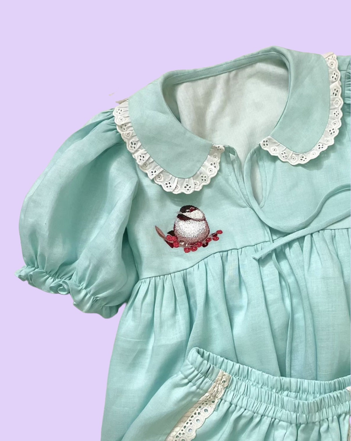 Can you even take it?! Bagichi girls will look all kinds of adorable in this peterpan collar top and shorts set. The top features a peterpan collar and bird embroidery with front neck tie up. Shorts has elastic encased waistband.• Turquoise blue linen co-ord fully lined with mul.