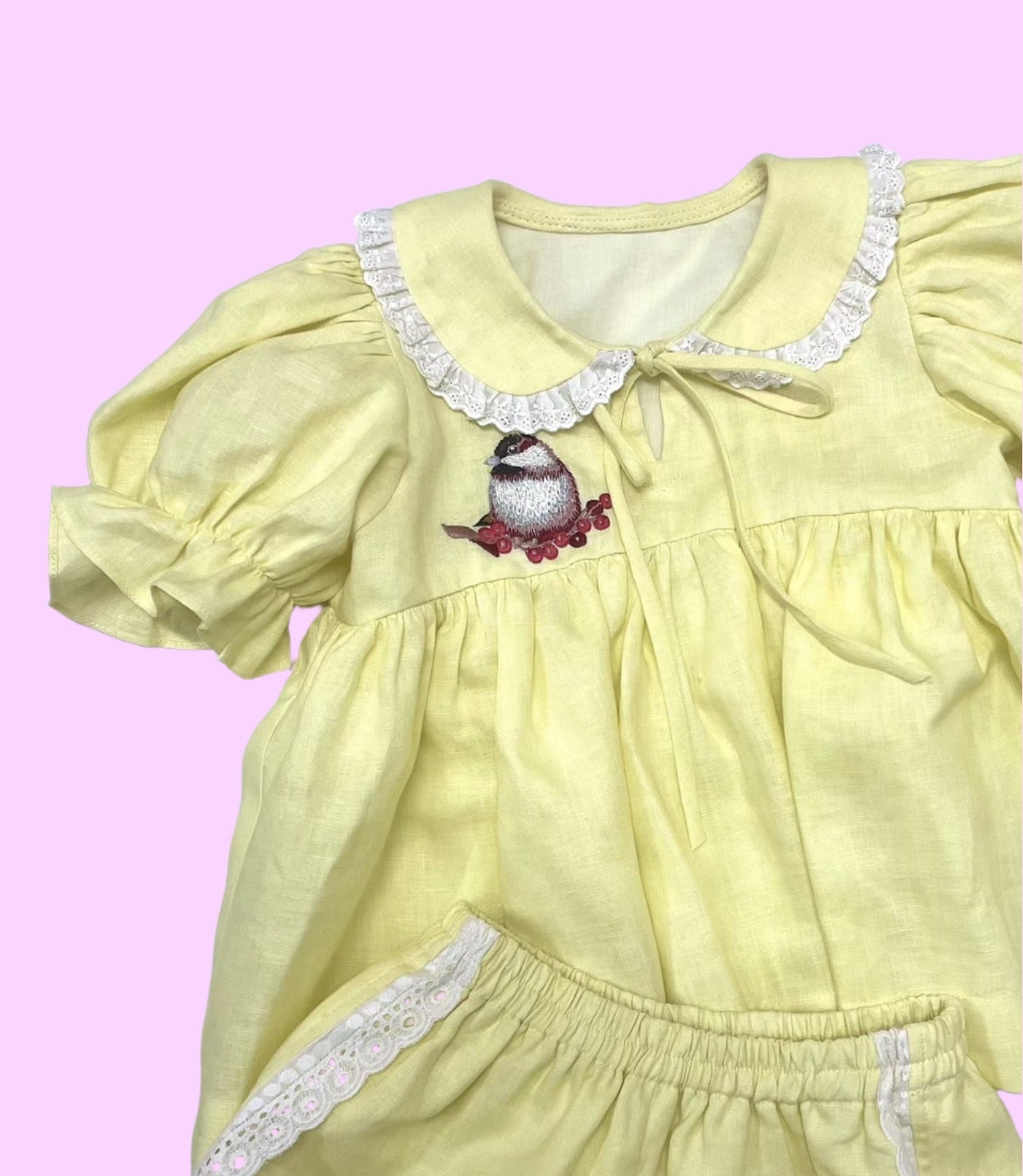 Can you even take it?! Bagichi girls will look all kinds of adorable in this peterpan collar top and shorts set. The top features a peterpan collar and bird embroidery with front neck tie up. Shorts has elastic encased waistband.• Lemon linen co-ord fully lined with mul.