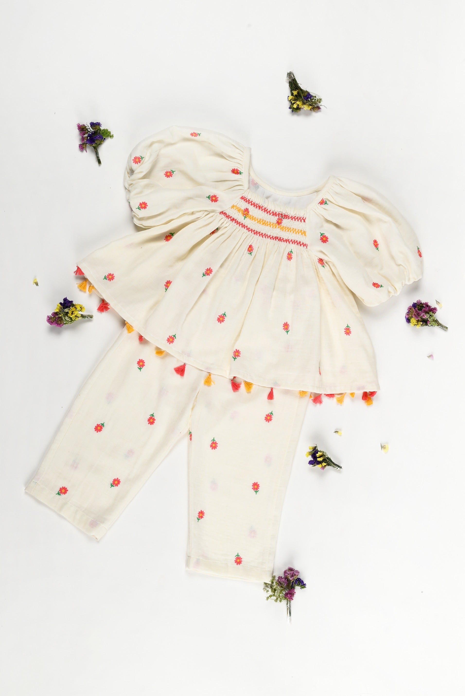 Are we ready to have some fun?! Fully embroidered with coral poppy flowers with colorful tassles and hand smocked neck? Plan your playdate and summer outings, this lightweight embroidered set is the perfect outfit #ootd.