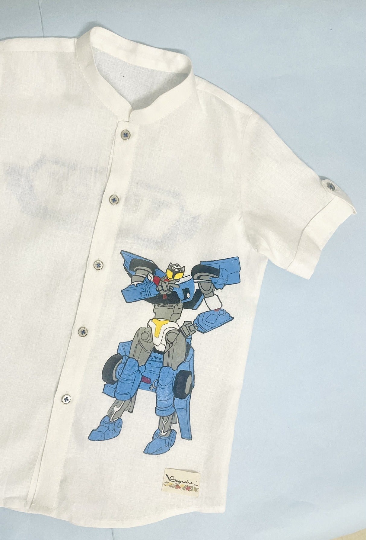 Good vibes? Check! Boys will look cool and casual in this hand painted Tobot Linen button up.This shirt is the perfect solution for when we want messy boys to look super neat and crisp with a soft fabric and their fave character. Pairs well with denims and chinos.• Soft Linen shirt